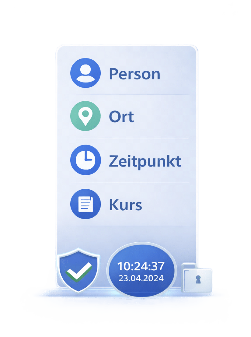 Jede Anwesenheit wird zu einem prüffähigen Teilnahme-Nachweis – eindeutig einer Identität, einem Ort, einem Zeitpunkt und einer Maßnahme zugeordnet.